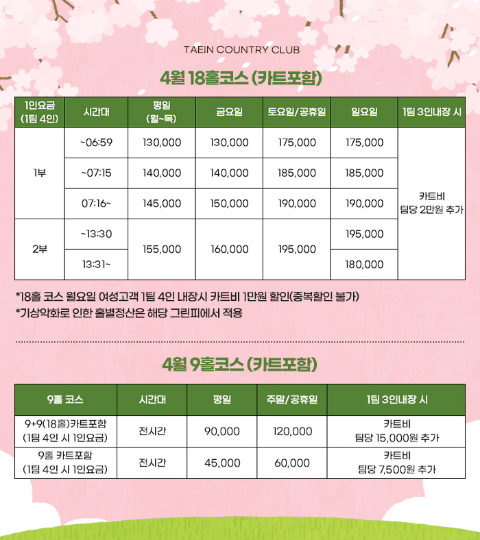 전북 정읍시 태인면 정읍북로 1739-90 Tel 063-532-7200 18코스 예약 063-571-9000 Copyright(c) Taein Country Club All rights reserved.