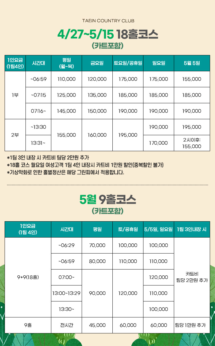 전북 정읍시 태인면 정읍북로 1739-90 Tel 063-532-7200 18코스 예약 063-571-9000 Copyright(c) Taein Country Club All rights reserved.
