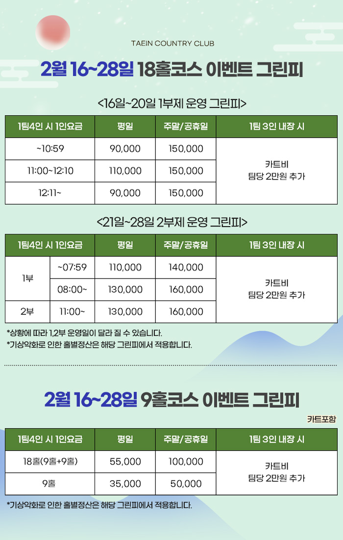 전북 정읍시 태인면 정읍북로 1739-90 Tel 063-532-7200 18코스 예약 063-571-9000 Copyright(c) Taein Country Club All rights reserved.