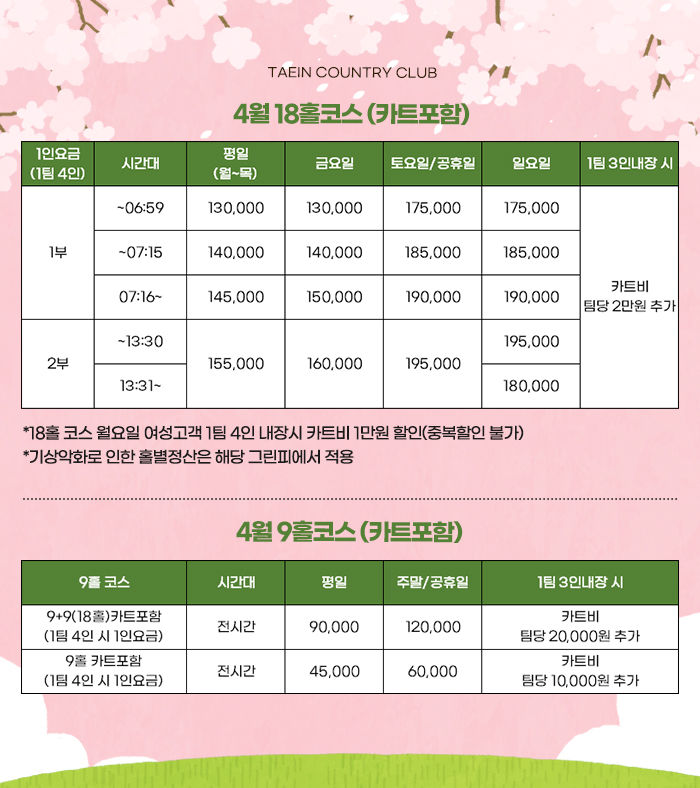 전북 정읍시 태인면 정읍북로 1739-90 Tel 063-532-7200 18코스 예약 063-571-9000 Copyright(c) Taein Country Club All rights reserved.
